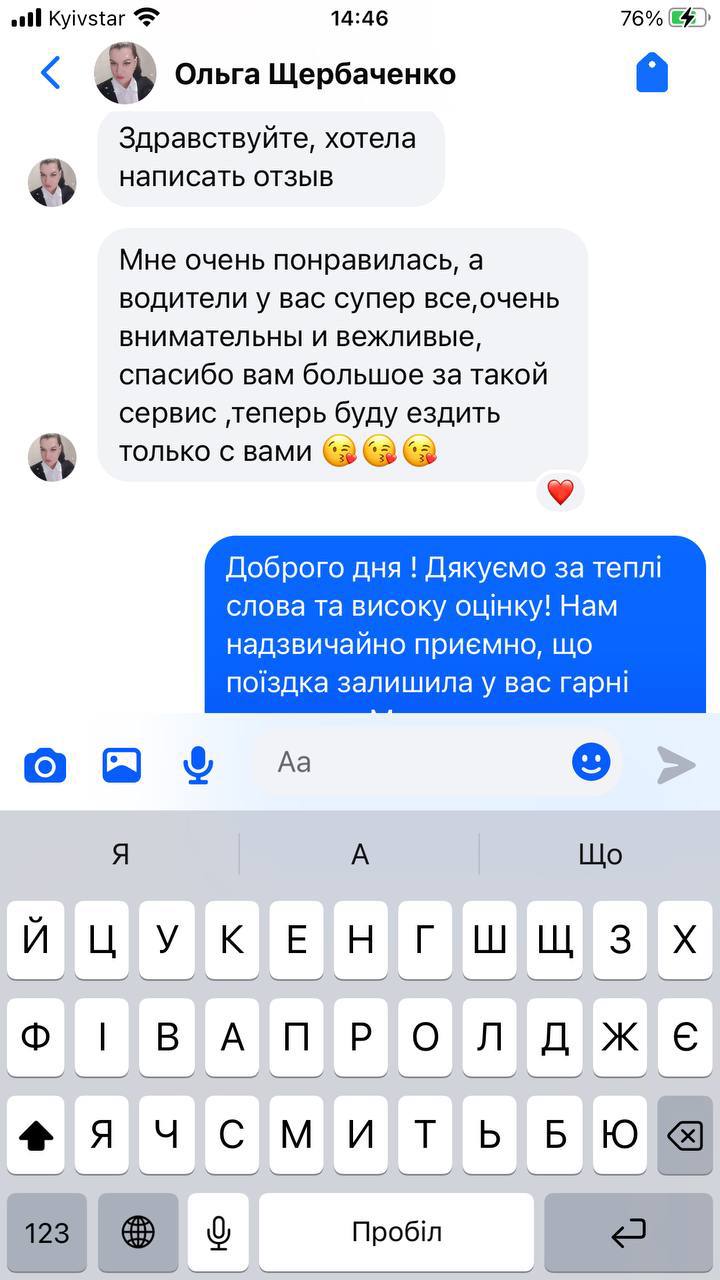 Дякую велике за надані вами послуги, безпечно та швидко довезли мою маму до нас. Водію Ігорю особлива подяка!