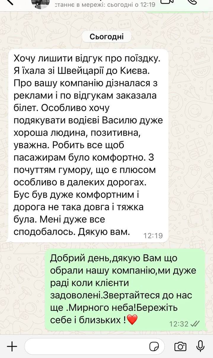 Хочу лишити відгук про поїздку. Я їхала зі Швейцарії до Києва. Про вашу компанію дізналася з реклами та за відгуками замовила квиток. Особливо хочу подякувати водієві Василю....