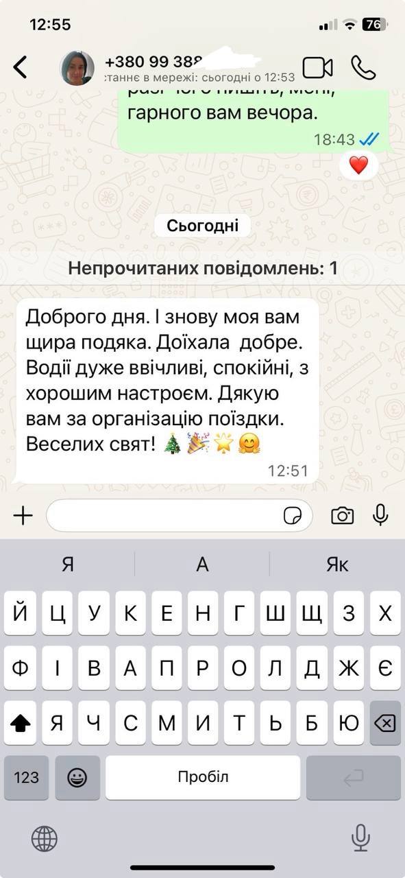 Доброго дня. І знову моя вам щира подяка. Доїхала добре. Водії дуже ввічливі, спокійні, з хорошим настроєм. Дякую вам за організацію поїздки. Веселих свят!