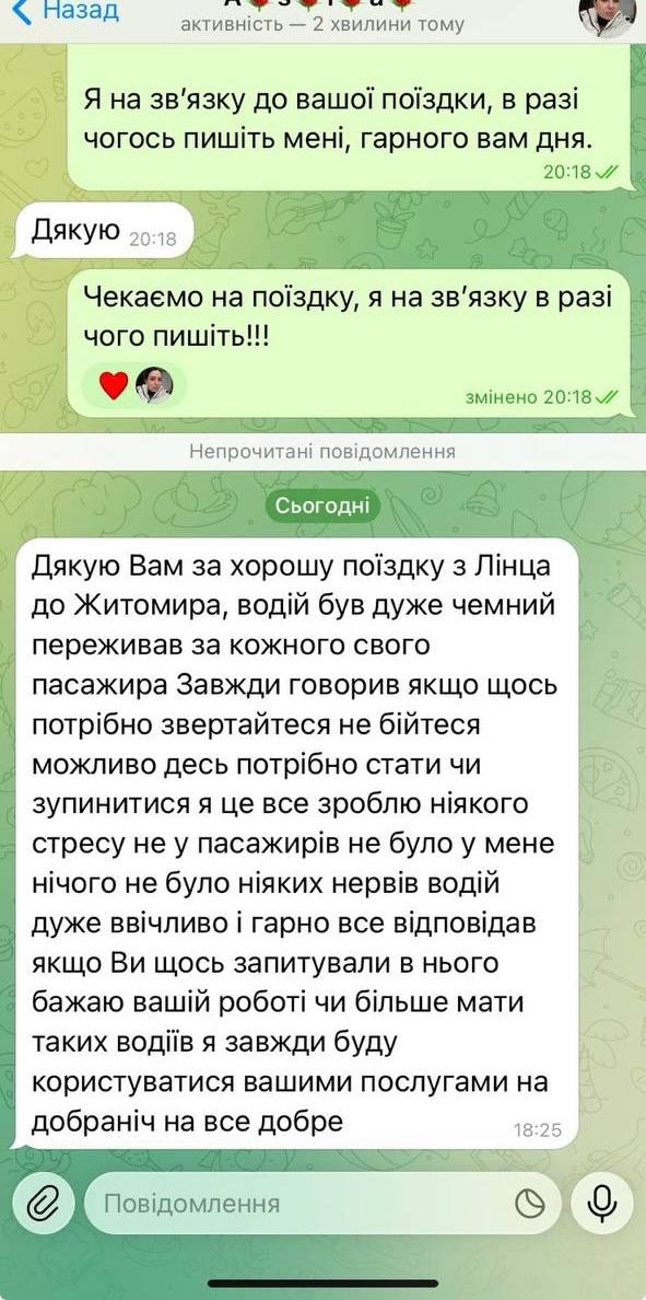 Дякую Вам за хорошу поїздку з Лінца до Житомира, водій був дуже чемний, переживав за кожного свого пасажира. Завжди говорив: якщо щось потрібно — звертайтеся, не бійтеся, можливо десь потрібно стати чи зупинитися — я це все зроблю....