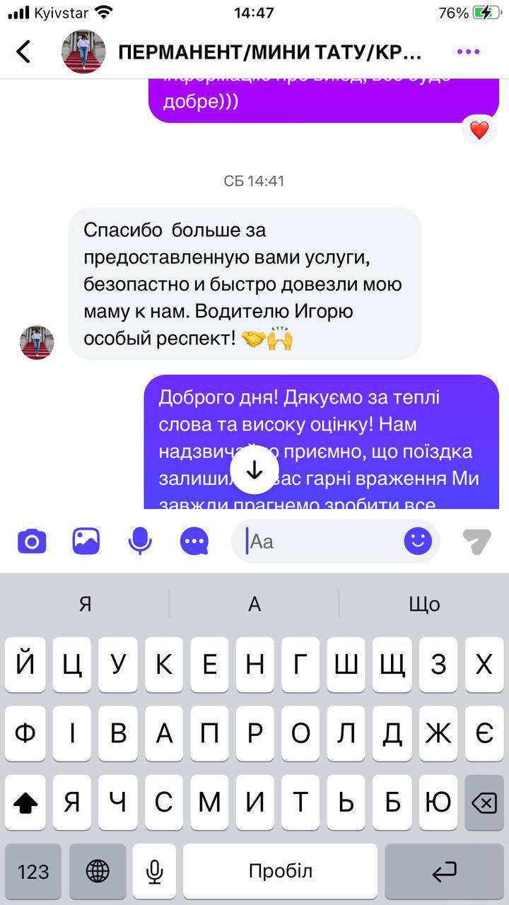 Дякую велике за надані вами послуги, безпечно та швидко довезли мою маму до нас. Водію Ігорю особлива подяка!