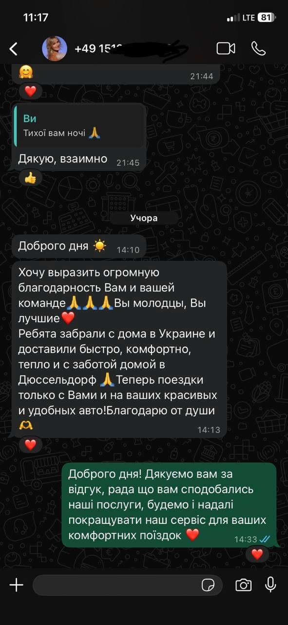 Дякую Вам за хорошу поїздку з Лінца до Житомира, водій був дуже чемний, переживав за кожного свого пасажира. Завжди говорив: якщо щось потрібно — звертайтеся, не бійтеся, можливо десь потрібно стати чи зупинитися — я це все зроблю....