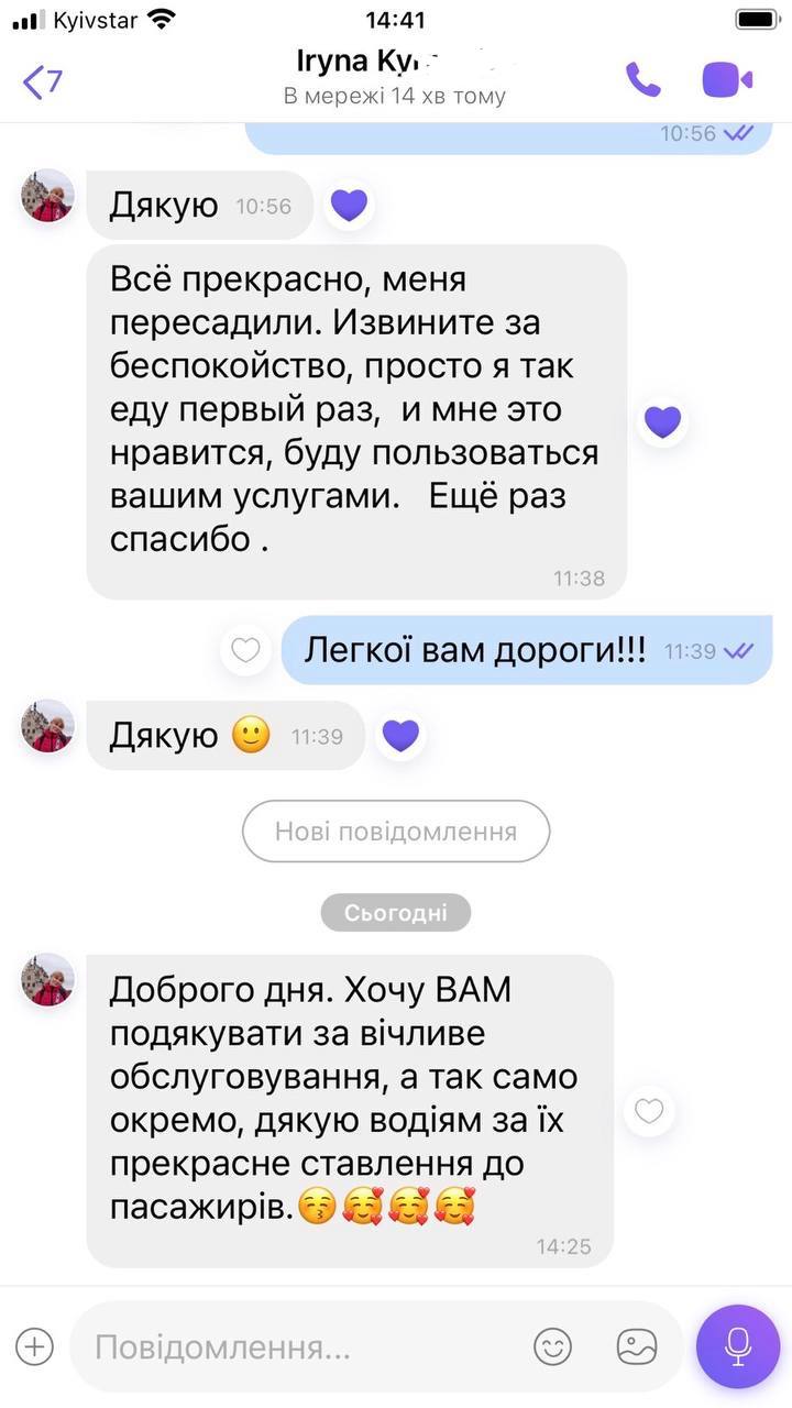 Хочу лишити відгук про поїздку. Я їхала зі Швейцарії до Києва. Про вашу компанію дізналася з реклами та за відгуками замовила квиток. Особливо хочу подякувати водієві Василю....